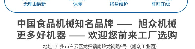 廣州旭眾食品機(jī)械有限公司是一家集科研開發(fā),生產(chǎn)設(shè)計(jì),營銷服務(wù)為一體的現(xiàn)代化生產(chǎn)企業(yè)?,F(xiàn)代化生產(chǎn)車間,精湛制造技術(shù),所產(chǎn)機(jī)械歷經(jīng)市場重重考驗(yàn),不斷贏得海內(nèi)外客戶的贊譽(yù)。