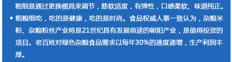 SZ-30不銹鋼米粉機(jī),可生產(chǎn)米粉、米線、桂林米粉、過橋米線、年糕、糍粑等產(chǎn)品。各種形狀都可生產(chǎn)(圓、扁),加工食品外表光滑,厚薄、寬窄、粗細(xì)均勻可調(diào),筋軟適度,有彈性,口感柔軟、味道純正。