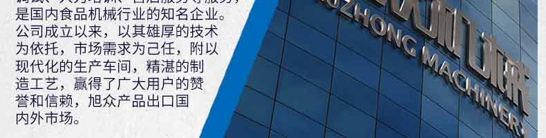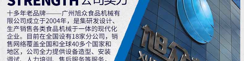廣州旭眾食品機械有限公司是一家集科研開發(fā),生產(chǎn)設(shè)計,營銷服務為一體的現(xiàn)代化生產(chǎn)企業(yè)?,F(xiàn)代化生產(chǎn)車間,精湛制造技術(shù),所產(chǎn)機械歷經(jīng)市場重重考驗,不斷贏得海內(nèi)外客戶的贊譽。