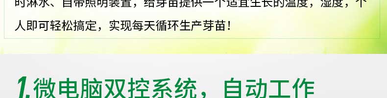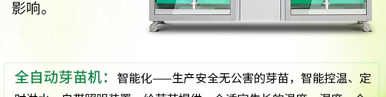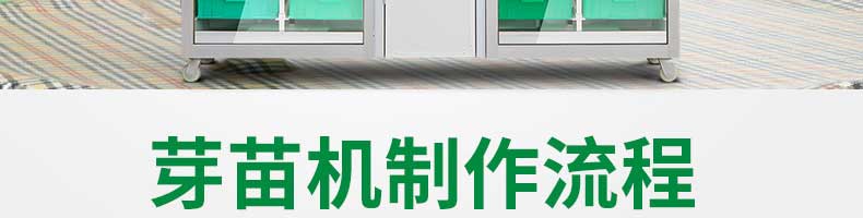 芽苗機系列,全自動芽苗機:智能化一生產安全無公害的芽苗,智能控溫、定時淋水、自帶照明裝置,給芽苗提供一個適宜生長的溫度,濕度,個人即可輕松搞定,實現(xiàn)每天循環(huán)生產芽苗!