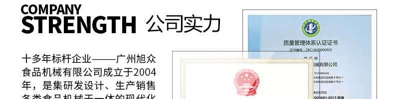 廣州旭眾食品機械有限公司是一家集科研開發(fā),生產設計,營銷服務為一體的現(xiàn)代化生產企業(yè)。現(xiàn)代化生產車間,精湛制造技術,所產機械歷經市場重重考驗,不斷贏得海內外客戶的贊譽。