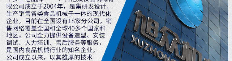 廣州旭眾食品機(jī)械有限公司是一家集科研開發(fā),生產(chǎn)設(shè)計,營銷服務(wù)為一體的現(xiàn)代化生產(chǎn)企業(yè)?,F(xiàn)代化生產(chǎn)車間,精湛制造技術(shù),所產(chǎn)機(jī)械歷經(jīng)市場重重考驗,不斷贏得海內(nèi)外客戶的贊譽。